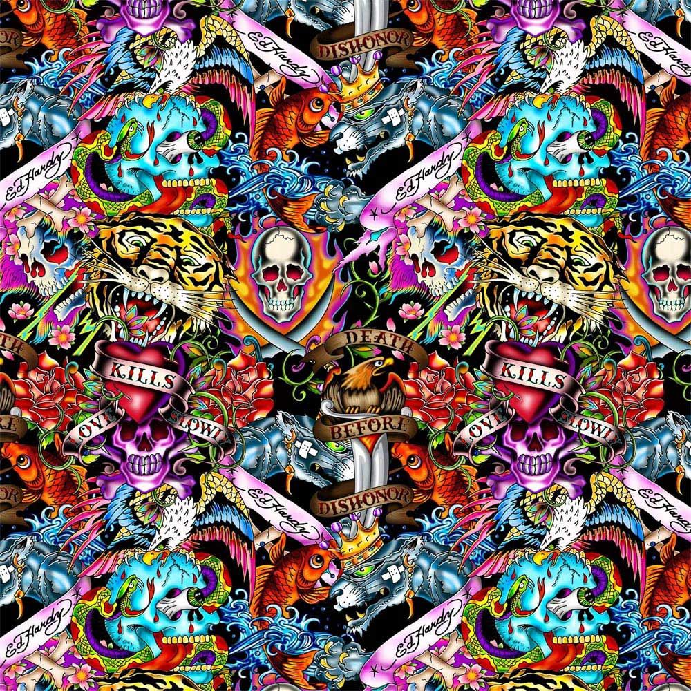 | Ed Hardy pour le Jenny Dark (collaboration exclusive) Reconnu mondialement pour le style éclaté de ses dessins aux couleurs vives, Ed Hardy signe un design exclusif pour les unités du Jenny Dark. À mi-chemin entre le style Baroque et le PopArt, ce motif se prête très bien à une chambre à coucher, et s'agencera avec tous les vêtements Ed Hardy de votre collection. Pour: Tapis, sièges de toilette, rideaux de douche, rideaux. |